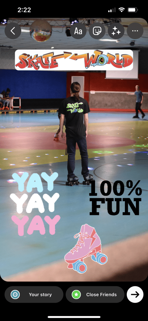 Now that your graphic is ready for the spotlight, it’s time to get it uploaded to Instagram! To do this, you must first send the image to the device that has the Instagram app installed. Once the image is on your device, go to your camera roll and copy the image. From there, open the Instagram app and tap your profile photo to start a new story. Tap the type tool on the left hand side of the screen, act as if you are about to type, then press next without typing anything. On this new screen, tap the text tool button at the top of the screen, then long press the screen to paste your sticker!
